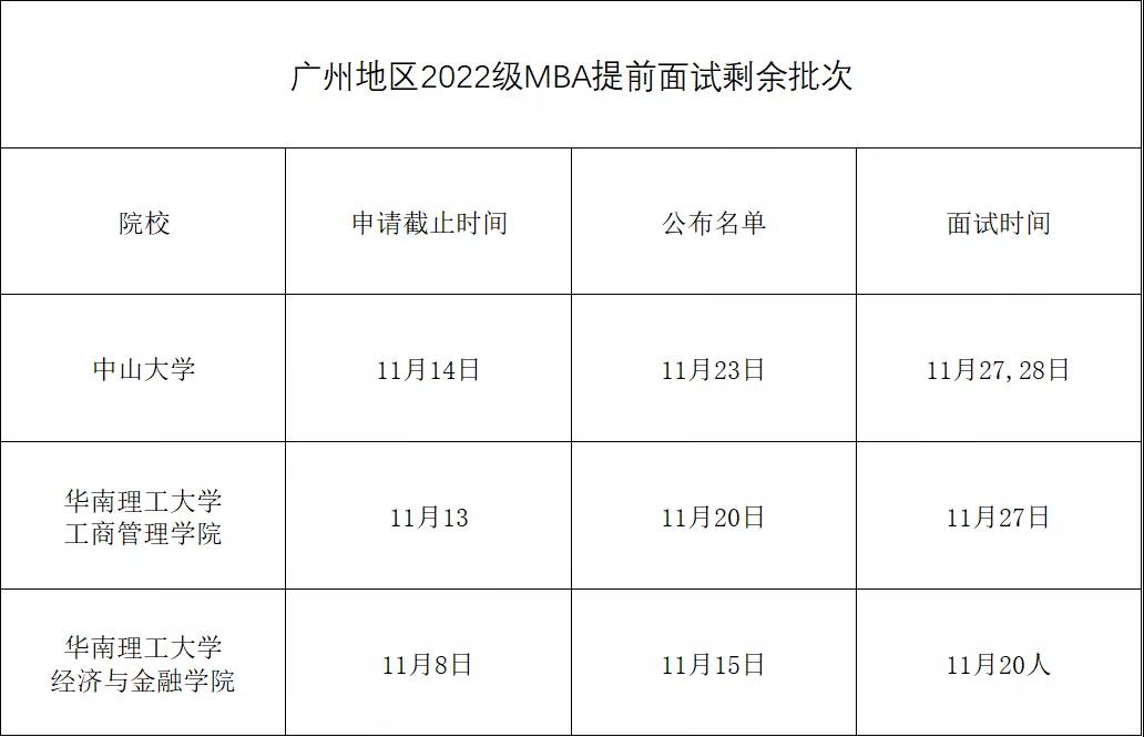 雖然報(bào)名結(jié)束、網(wǎng)上確認(rèn)也結(jié)束,之前因各種原因錯(cuò)過(guò)MBA提前面試的同學(xué)來(lái)說(shuō),還有批次嗎?中山大學(xué)、華南理工大學(xué)還有最后的機(jī)會(huì),時(shí)不我待,大家抓緊啦!
