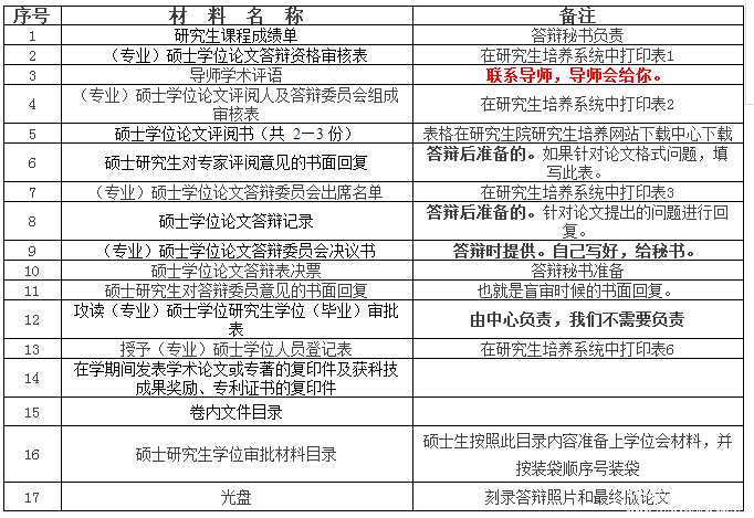 答辯的應(yīng)該準(zhǔn)備的其它材料,有的是答辯秘書自己負(fù)責(zé),有的需要自己負(fù)責(zé)。有的答辯秘書,提前通知你,有的是在答辯前一天或半天,開會(huì)的時(shí)候提出。為了提高效率,我認(rèn)為,答辯秘書時(shí)間和精力同樣有限,自己事先準(zhǔn)備為妙。下面,我把華電MBA論文材料清單的內(nèi)容詳細(xì)說一下。見下表。