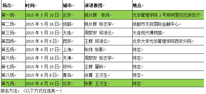 導(dǎo)讀:北京大學光華管理學院將于2015年5月至8月間,在北京、成都、大連、西安、上海、鄭州、青島等9城市再次舉行盛大的MBA全國公開課活動。
