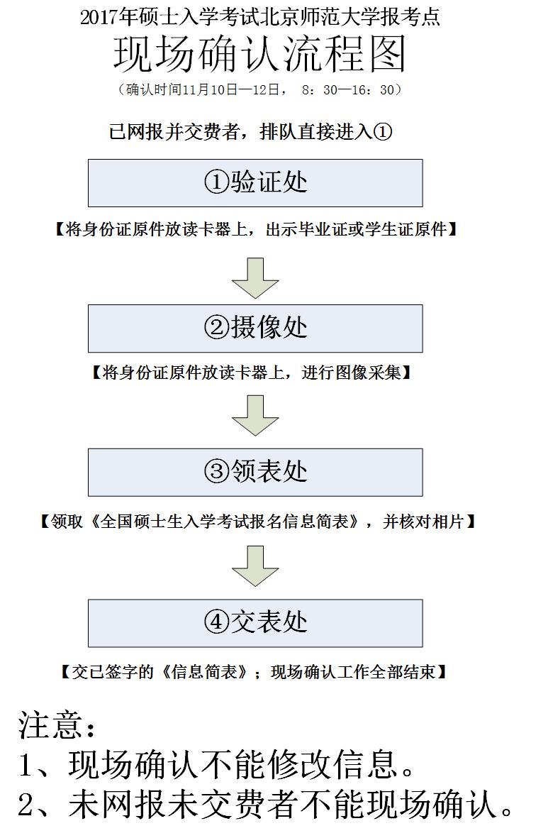 1.本報(bào)考點(diǎn)現(xiàn)場(chǎng)確認(rèn)對(duì)象為:網(wǎng)報(bào)時(shí)選擇“1127北京師范大學(xué)”報(bào)考點(diǎn),成功繳納報(bào)名費(fèi),就讀學(xué)校在北京的應(yīng)屆本科畢業(yè)生、單獨(dú)考試生、工作或戶口在北京的非應(yīng)屆考生(包括工商管理/公共管理/教育管理/項(xiàng)目管理等專業(yè)學(xué)位)。未網(wǎng)報(bào)及未交費(fèi)考生不得現(xiàn)場(chǎng)確認(rèn)。