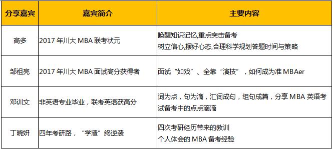 導(dǎo)讀:幫助廣大考生掌握四川大學(xué)商學(xué)院MBA項(xiàng)目2018年招生政策,提高備考和學(xué)習(xí)效率,中心將于10月15日舉辦2018年招生說(shuō)明暨備考經(jīng)驗(yàn)分享會(huì)。屆時(shí),川大MBA2017年入學(xué)聯(lián)考狀元、入學(xué)獎(jiǎng)學(xué)金獲得者、通過(guò)備考復(fù)習(xí)成績(jī)大幅提升的多名同學(xué)將帶來(lái)他們寶貴的備考經(jīng)驗(yàn)與學(xué)習(xí)心得分享,歡迎各位考生勇躍參加。因場(chǎng)地有限,參加者須于10月13日中午12:00點(diǎn)前在中心網(wǎng)站上進(jìn)行預(yù)約