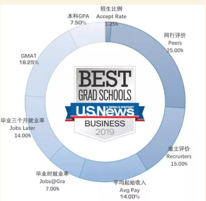 學(xué)校排名最后的總分有40%來自于別校校務(wù)人員及Recruiters對該校的點(diǎn)評 (各占25%和15%) ,有35%來自于學(xué)生應(yīng)屆畢業(yè)后的就業(yè)成績 (包括14%的平均畢業(yè)薪資與獎(jiǎng)金、7%的畢業(yè)就業(yè)率及14%的畢業(yè)后三個(gè)月的就業(yè)率成績) ,加上最后的25%來自于錄取學(xué)生的背景評比 (16.25%取自于GMAT的平均分?jǐn)?shù)、7.5%是學(xué)生本科的平均成績以及1.25%的該年學(xué)生錄取率) 。