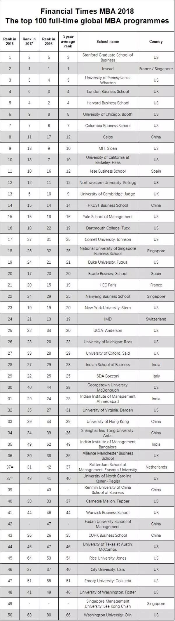 導讀: 2018年全球MBA前100高校 英國《金融時報》(Financial Times)發(fā)布全球MBA百強榜,中國7校上榜,均躋身前50強。中歐國際工商學院(第8名)、上海交通大學安泰經濟與管理學院(第34位)、中國人民大學商學院(第39位)、復旦大學管理學院(第42位)四校商學院位列其間,其余三校均為港校,包括香港科技大學(第14位)、香港大學(第33位)、香港中文大學(第43位)。