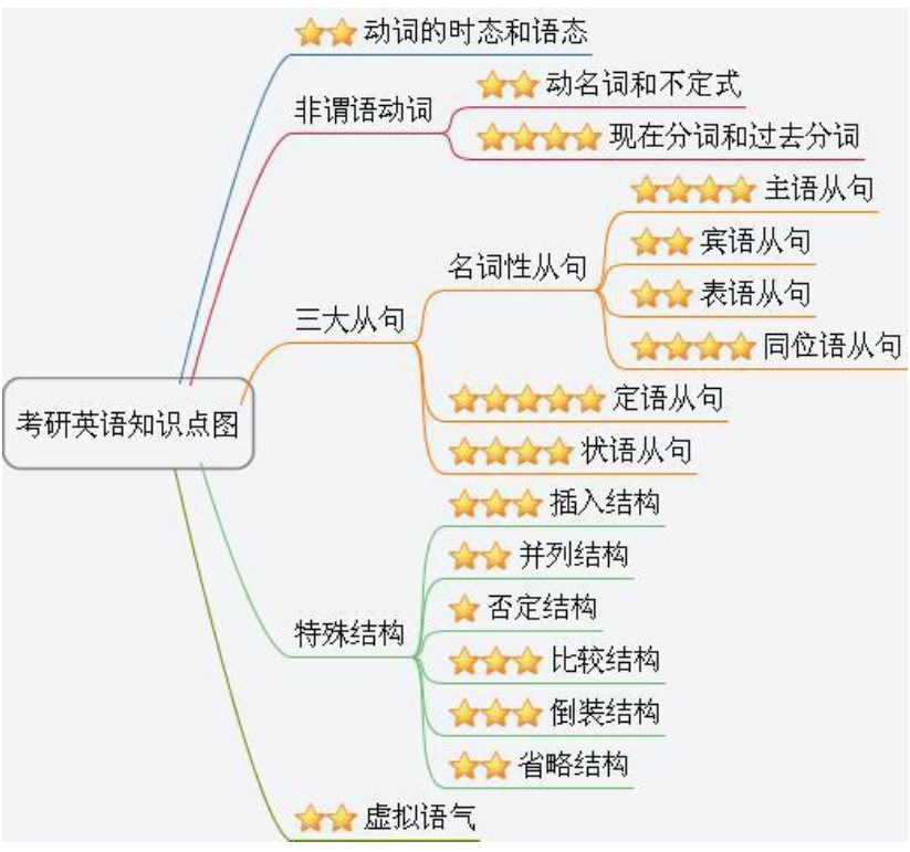 通過上圖的統(tǒng)計數(shù)據(jù),我們不難發(fā)現(xiàn):非謂語動詞、虛擬語氣、倒裝結(jié)構(gòu)、各種從句、比較結(jié)構(gòu)這幾種主要語法知識點(diǎn)都以或高或低的頻率出現(xiàn)在歷年真題的直接命題點(diǎn)處。其中,語法點(diǎn)的考查頻率始終位于前兩位的分別是三大從句和非謂語動詞,由此我們可明確得出結(jié)論:從句和非謂語形式是語法知識點(diǎn)中的首要考查點(diǎn),所以,我們應(yīng)該給予足夠的重視。除此之外,比較結(jié)構(gòu)、否定結(jié)構(gòu)、倒裝結(jié)構(gòu)、虛擬語氣等出現(xiàn)的頻次雖然較少,但一旦出現(xiàn),往往也是考點(diǎn)和直接命題點(diǎn),所以,我們總結(jié)考研語法知識體系如下: