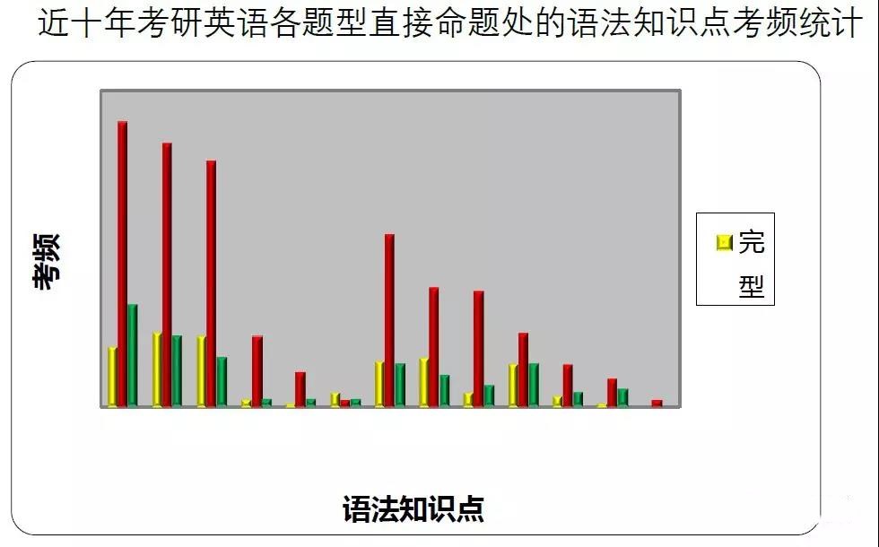 英語語法涉及面廣,涵蓋知識點(diǎn)多且細(xì)。但是在考研語法復(fù)習(xí)中,我們應(yīng)狠抓重點(diǎn),突破考點(diǎn)。對重點(diǎn)和考點(diǎn)的界定不能是主觀臆測,而是應(yīng)有事實根據(jù),就此,王博老師對近十年的考研英語真題各類題型(完型填空、閱讀、翻譯)直接命題處的語法知識點(diǎn)做了精細(xì)的統(tǒng)計與分析(見下圖):