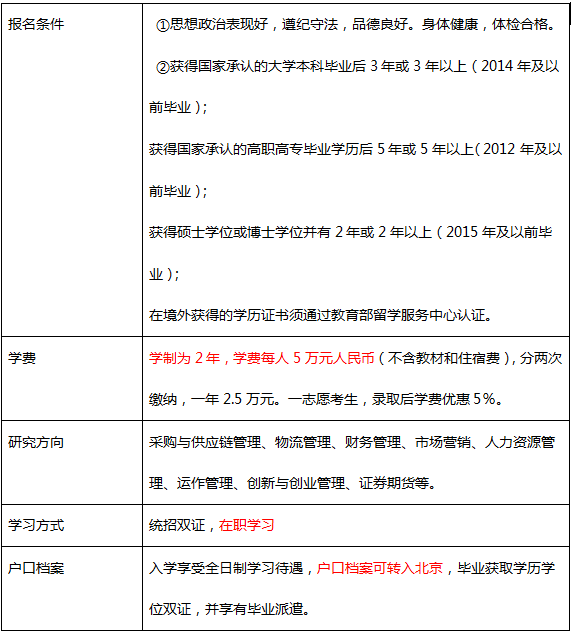 導讀:日前,北京物資學院MBA教育中心公布了2017年北京物資學院MBA招生簡章。2017年北京物資學院MBA學費為5萬元,入學享受全日制學習待遇,戶口檔
