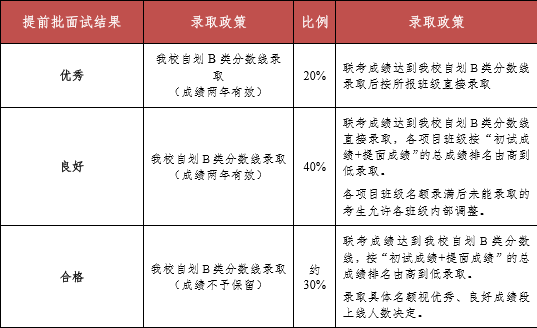 3. 獲得合格成績的待錄取考生,聯(lián)考成績達到我校自劃 B 類分數(shù)線,按“初試成績+提面成績”的總成績排名由高到低錄取。具體錄取名額視優(yōu)秀、良好成績段上線人數(shù)決定。合格名額約占錄取總名額的 30%。該預錄取資格不保留。
