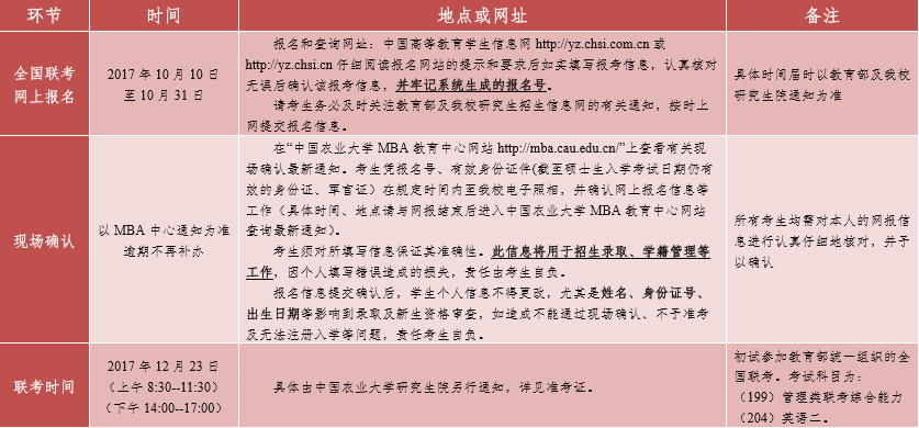 注意:報考我校MBA的考生必須選擇“中國農(nóng)業(yè)大學”為報考點,并于2017年10月10日至10月31日網(wǎng)上報名期間進行網(wǎng)上支付報名費,本考點不接收現(xiàn)場交費。