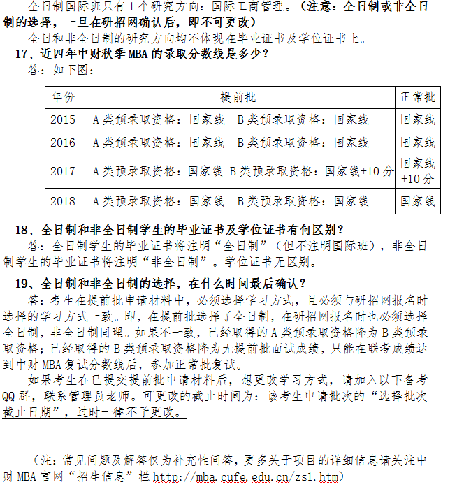 4、關(guān)于學(xué)習(xí)方式:全日制和非全日制的選擇:考生在提前批申請材料中,必須選擇學(xué)習(xí)方式,且必須與通過中國研究生招生信息網(wǎng)(簡稱研招網(wǎng),教育部指定網(wǎng)站)報(bào)名時(shí)(一般在10月)選擇的學(xué)習(xí)方式一致。即,在提前批選擇了全日制,在研招網(wǎng)報(bào)名時(shí)也必須選擇全日制,非全日制同理。如果不一致,已經(jīng)取得的A類預(yù)錄取資格降為B類預(yù)錄取資格;已經(jīng)取得的B類預(yù)錄取資格降為無提前批面試成績,只能在聯(lián)考成績達(dá)到中財(cái)MBA復(fù)試分?jǐn)?shù)線后,參加正常批復(fù)試。