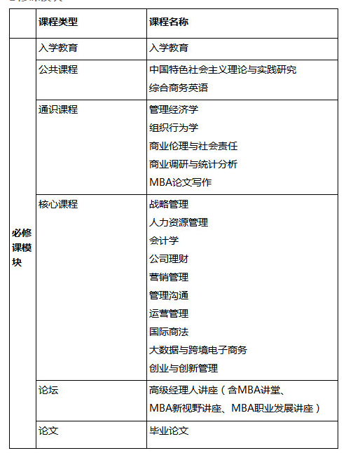 課程分為必修課及選修課兩大類:必修課包括5大模塊(公共課程模塊、通識(shí)課程模塊、核心課程模塊、論壇模塊),選修課包括“財(cái)務(wù)管理模塊、人力資源管理模塊、營(yíng)銷管理模塊、運(yùn)營(yíng)管理模塊、“一帶一路”模塊、實(shí)驗(yàn)實(shí)踐教學(xué)模塊”