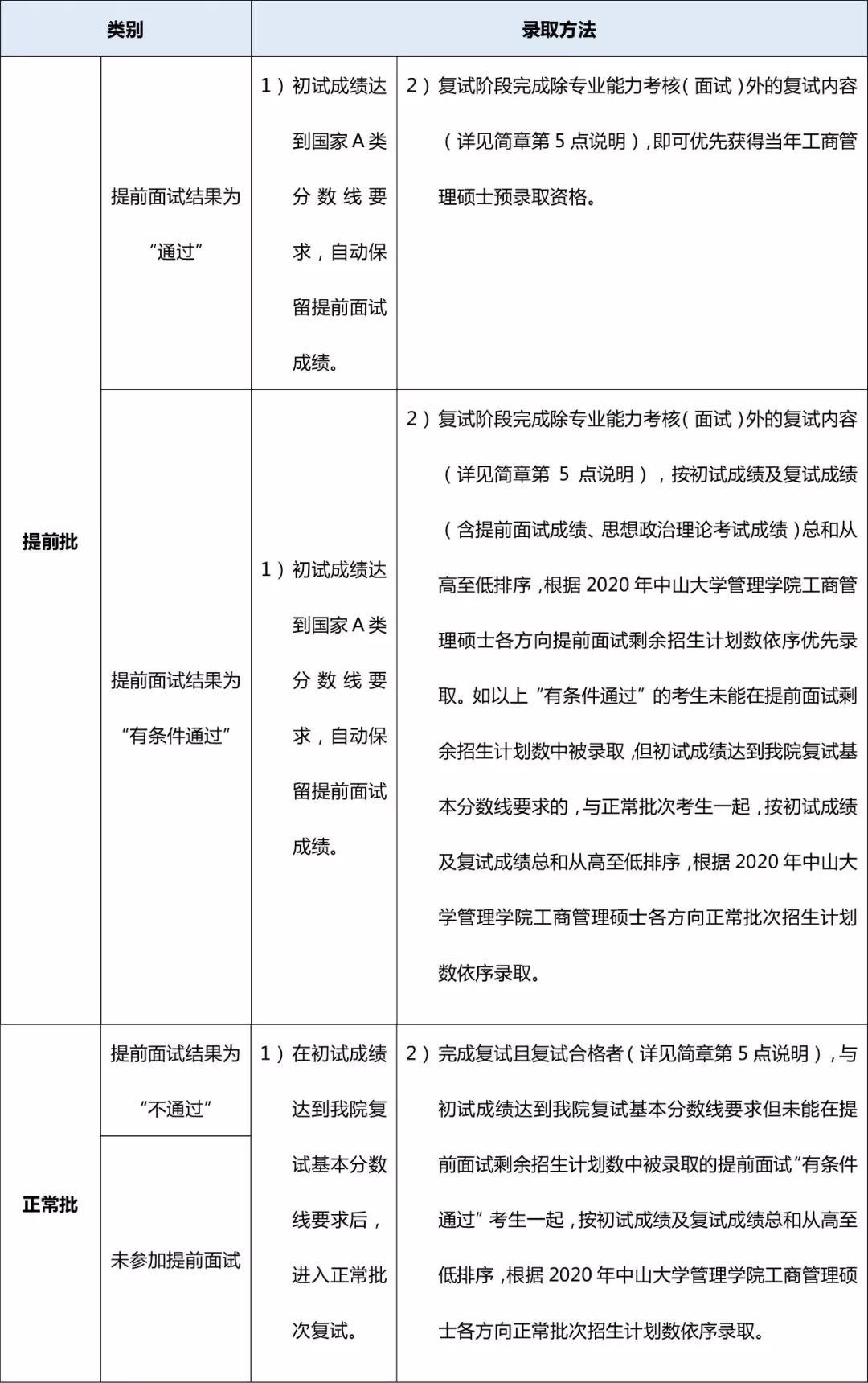 中山大學管理學院施行“提前批”和“正常批”招生,根據(jù)考生的初試成績、復試成績,并結合考生申請材料真實性復查、政審以及體檢結果,擇優(yōu)錄取。