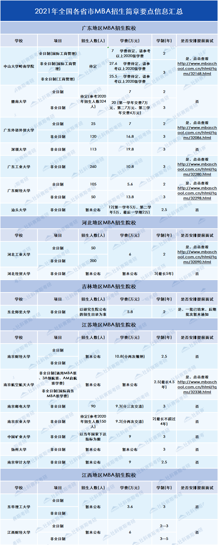 導(dǎo)讀:為了方便大家了解各院校的招生人數(shù)、學(xué)制學(xué)費(fèi)等相關(guān)信息,社科賽斯MBA備考網(wǎng)的小編給大家整理了“2021MBA招生簡(jiǎn)章:2021年各院校MBA招生簡(jiǎn)章匯總”的相關(guān)內(nèi)容。