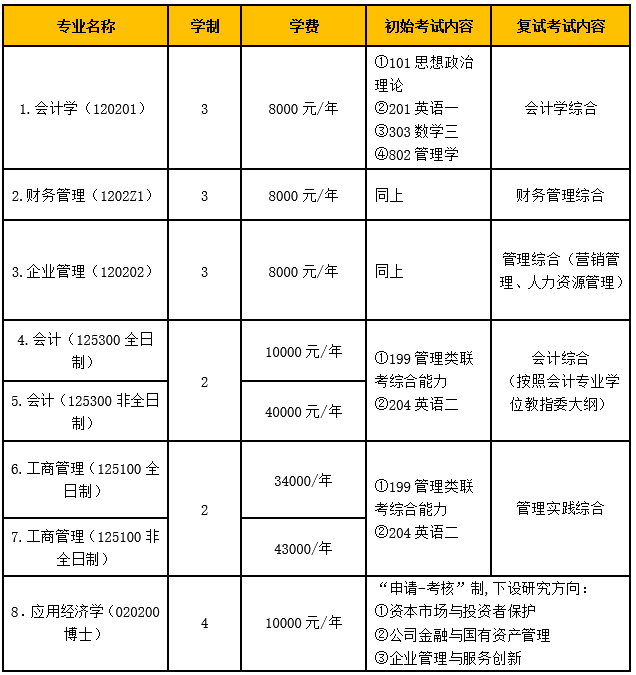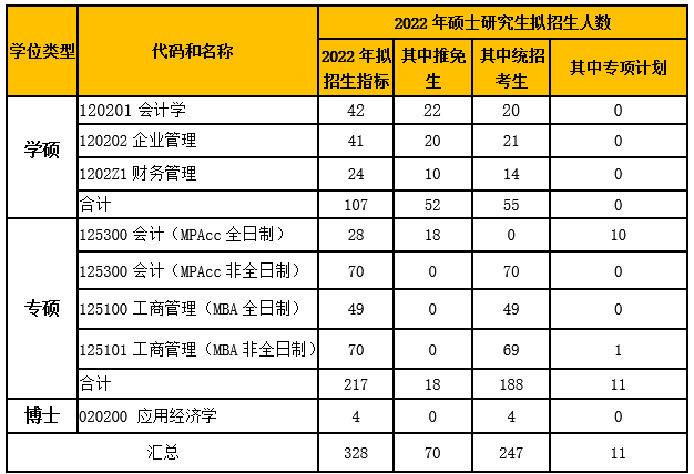 2022年商學(xué)院各學(xué)科擬招生計(jì)劃如下表。我院計(jì)劃招生人數(shù)為328人,其中學(xué)碩會(huì)計(jì)學(xué)42人、財(cái)務(wù)管理24人、企業(yè)管理41人;專碩會(huì)計(jì)(全日制)28人、會(huì)計(jì)(非全日制)70人、工商管理(全日制)49人、工商管理(非全日制)70人;應(yīng)用經(jīng)濟(jì)學(xué)博士研究生4人。