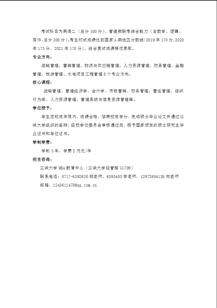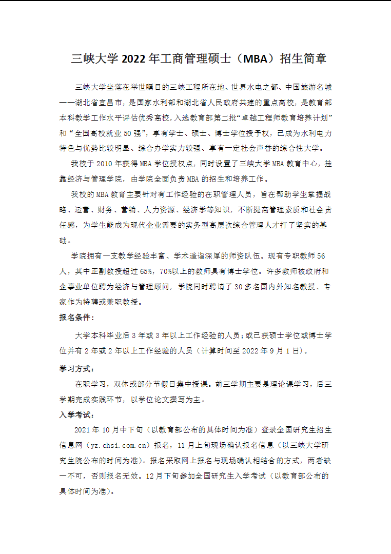 以上就是“2022MBA招生簡(jiǎn)章:三峽大學(xué)2022年工商管理碩士(MBA)招生簡(jiǎn)章”,更多相關(guān)信息,請(qǐng)持續(xù)關(guān)注本網(wǎng)站!