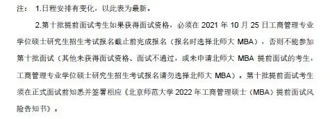 因2022年全國(guó)碩士研究生招生考試網(wǎng)上報(bào)名時(shí)間較往年有提前,北師大2022年MBA的提前面試批次及時(shí)間安排做出調(diào)整,最新見(jiàn)下圖及說(shuō)明。
